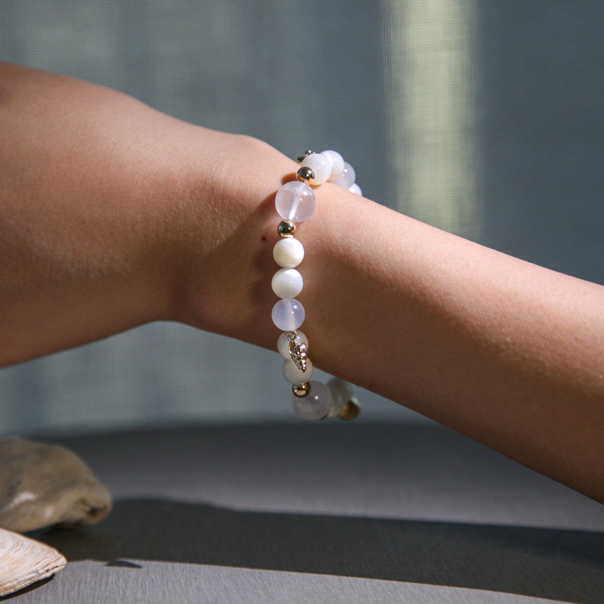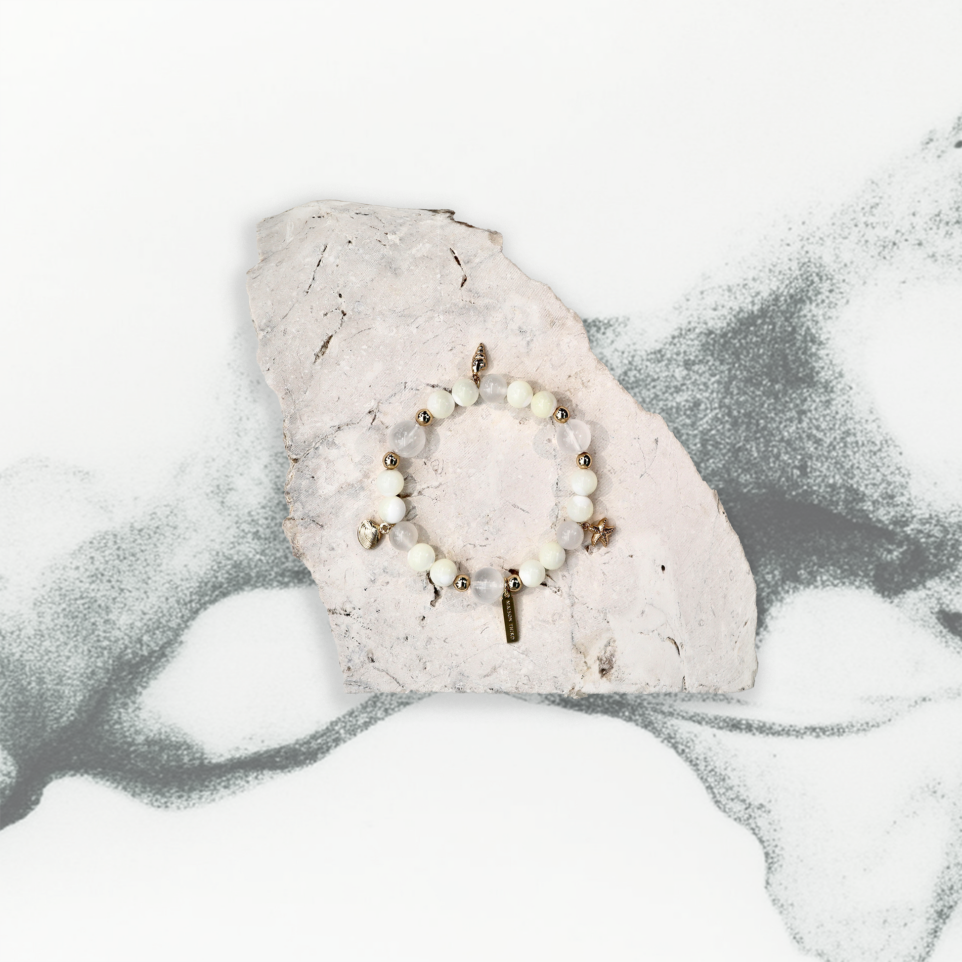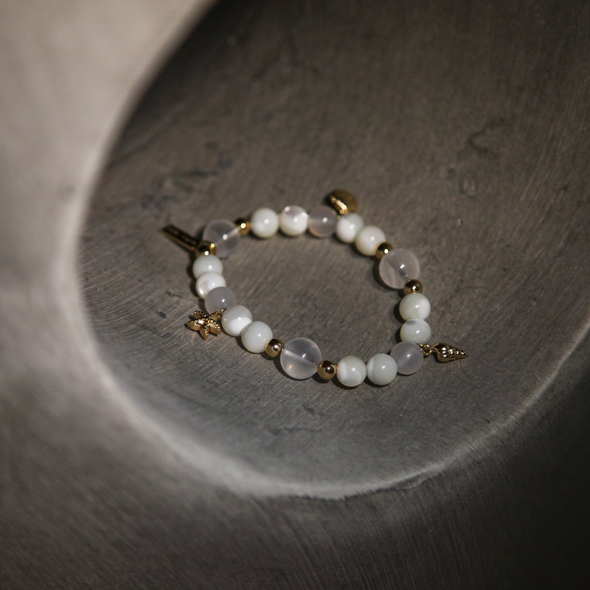 The Beachwalk bracelet evokes the memory of strolling along a white sand shore, golden sunset reflecting on the waves, and the scent of salt in the air. Featuring Mother of Pearl and White Jade, its soft glow embodies the clarity and elegance of the Metal element. Gold ocean-themed charms add a playful touch, capturing the rhythm of the sea and the tranquility of the moment.