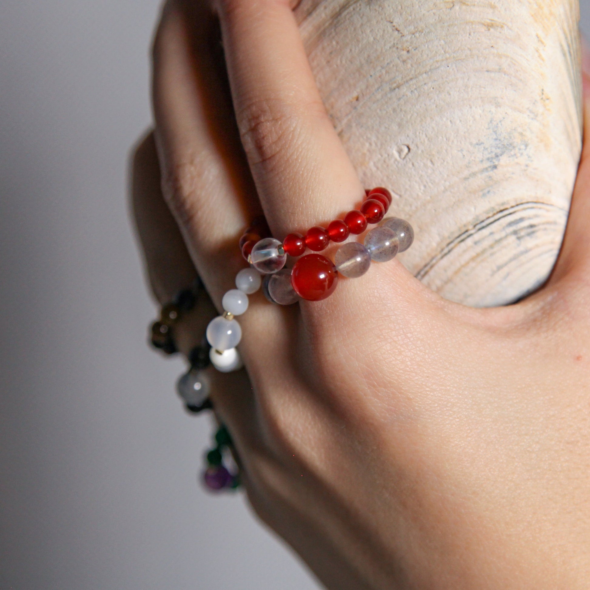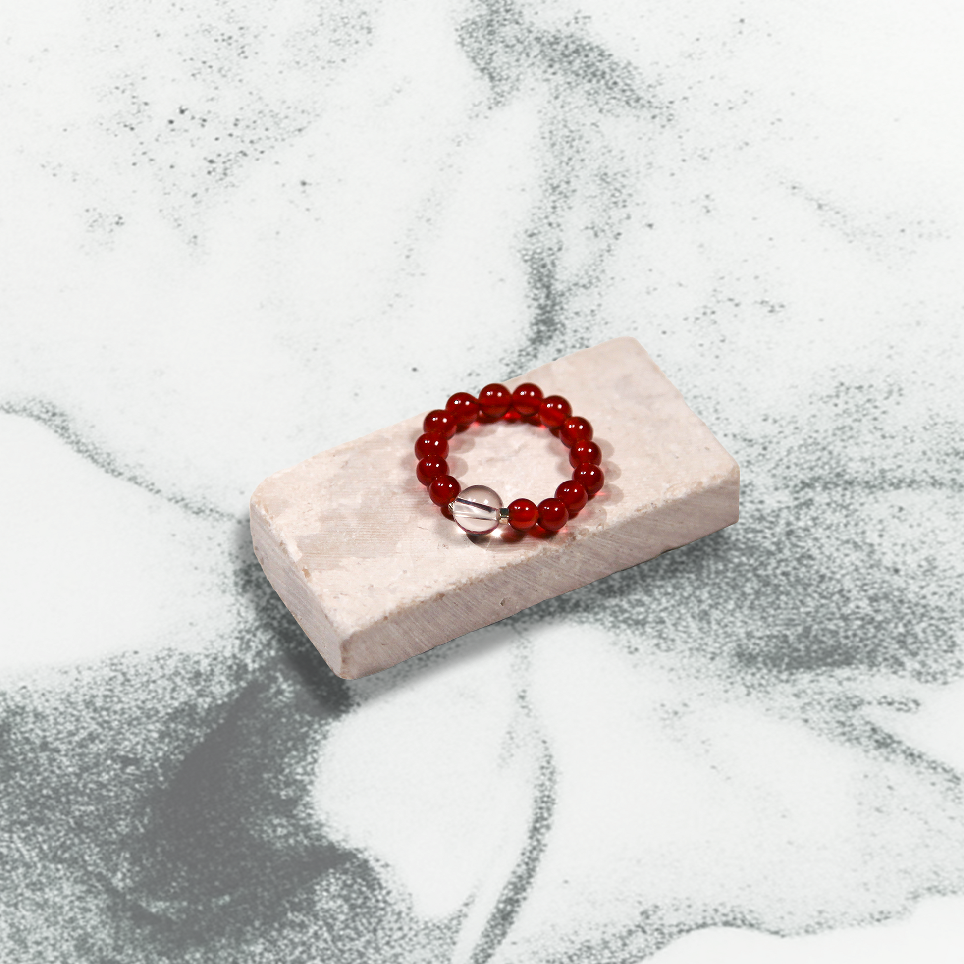 The Ignite beaded ring is a bold, fiery statement, featuring the ember-like glow of red carnelian paired with clear quartz, catching light beautifully. Radiating passion and vitality, this piece channels the transformative power of the Fire element—bold, unstoppable, and full of life. Whether worn as a spark of motivation or a symbol of inner strength, Ignite fuels confidence and inspires action.