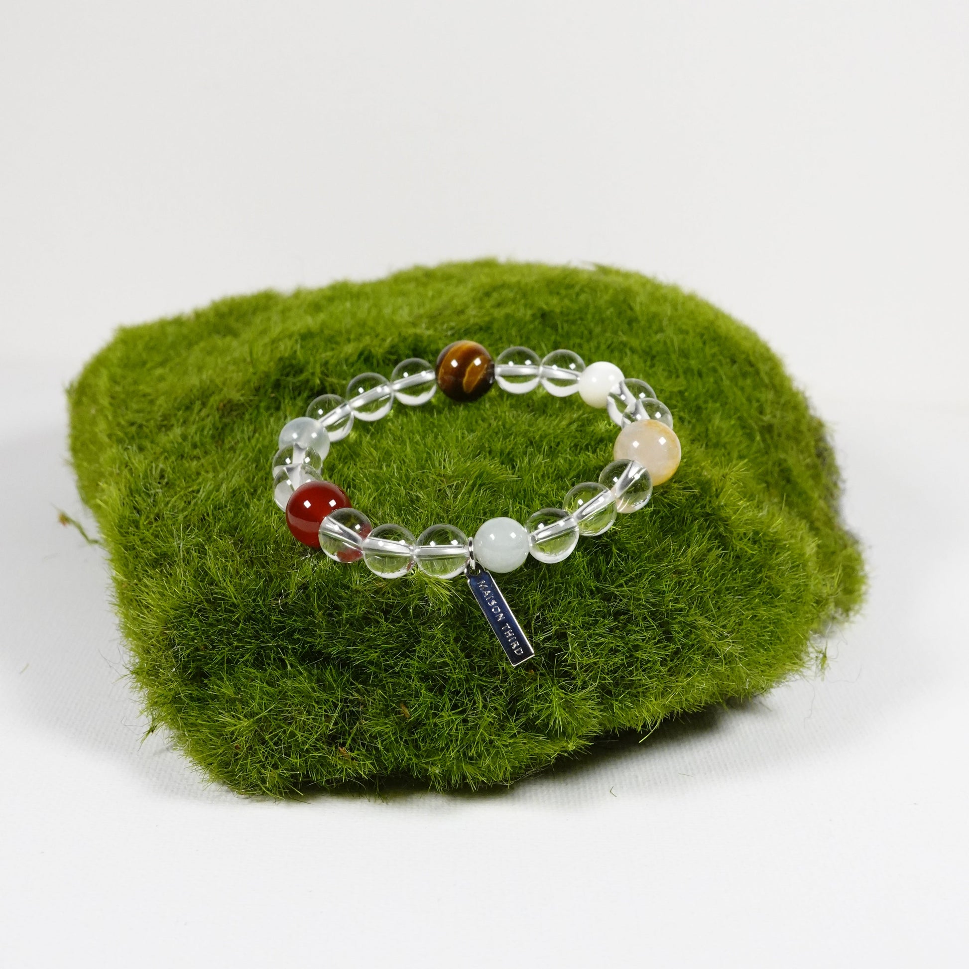 Featuring clear quartz, tiger's eye, red carnelian, jade, sakura agate, mother of pearl, and moonstone, the Inner Balance bracelet harmonizes the energies of all five elements, making it a perfect choice for anyone seeking balance or unsure of which energy they need. It serves as a versatile, powerful tool to restore equilibrium. The playful, vibrant color palette makes this piece a fun everyday accessory that goes with every look.