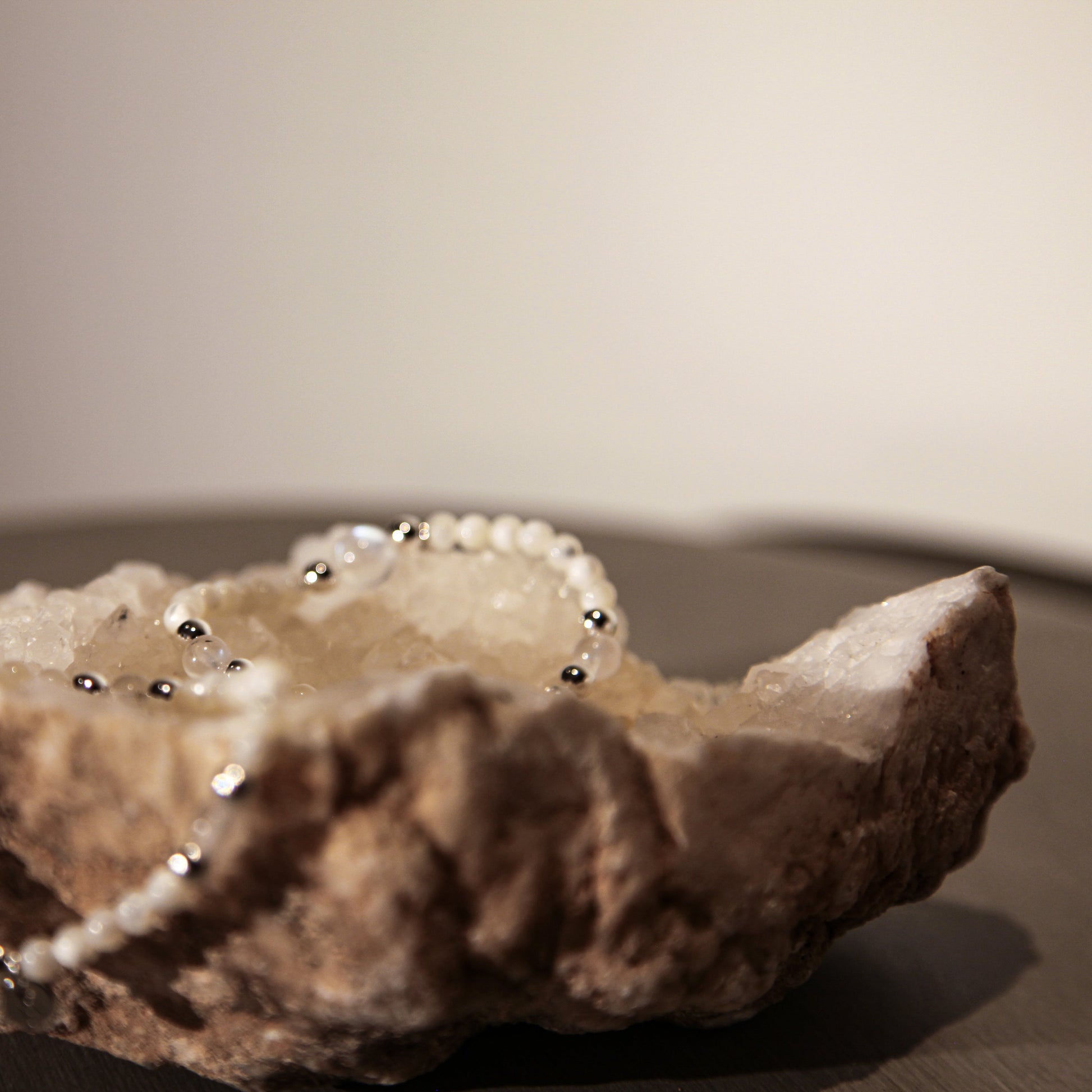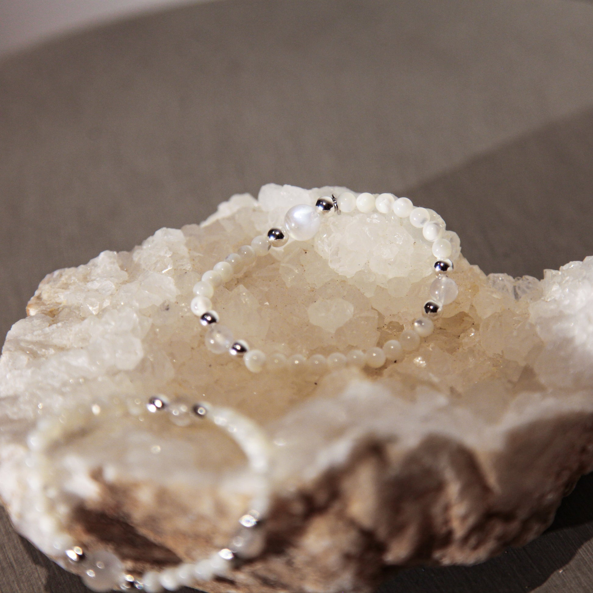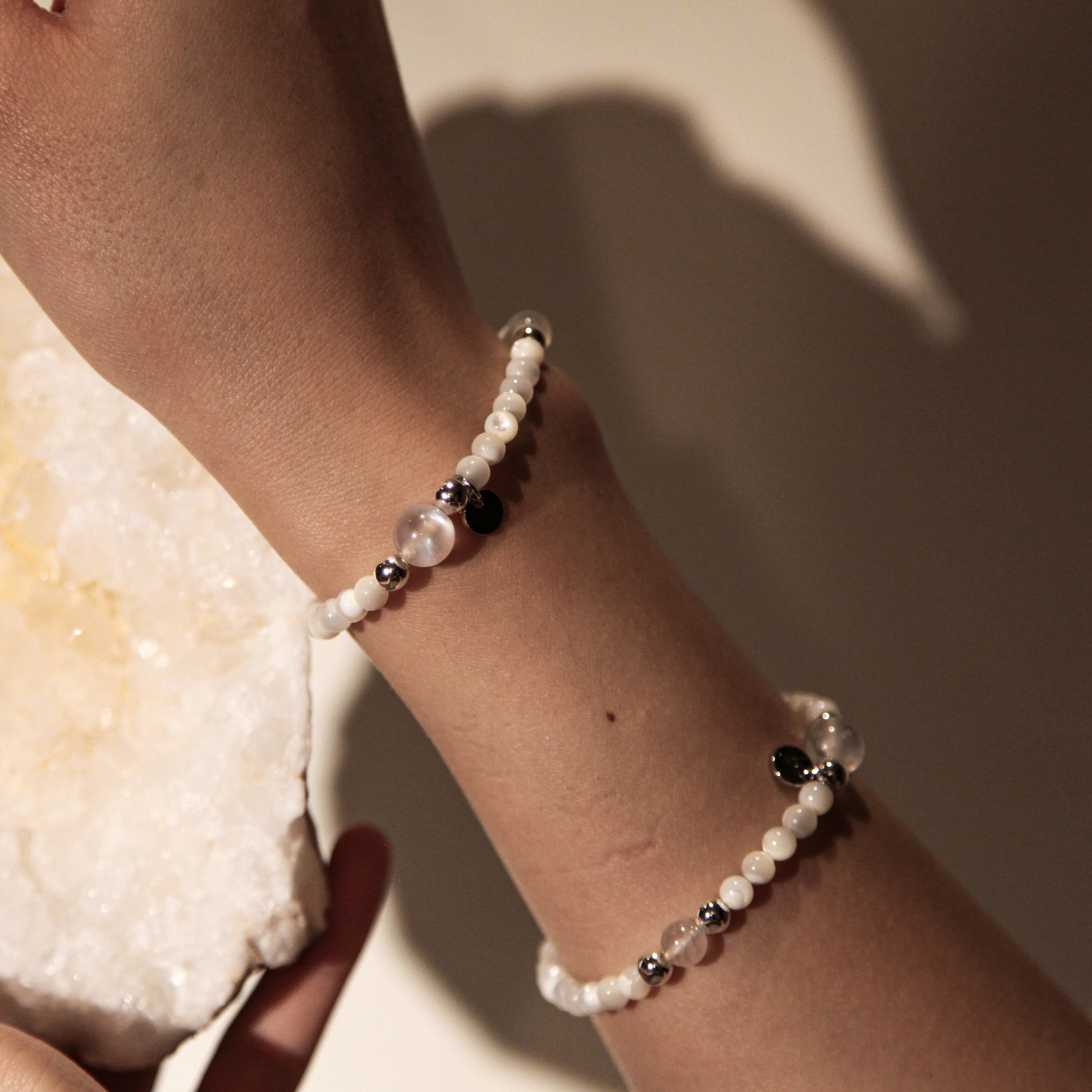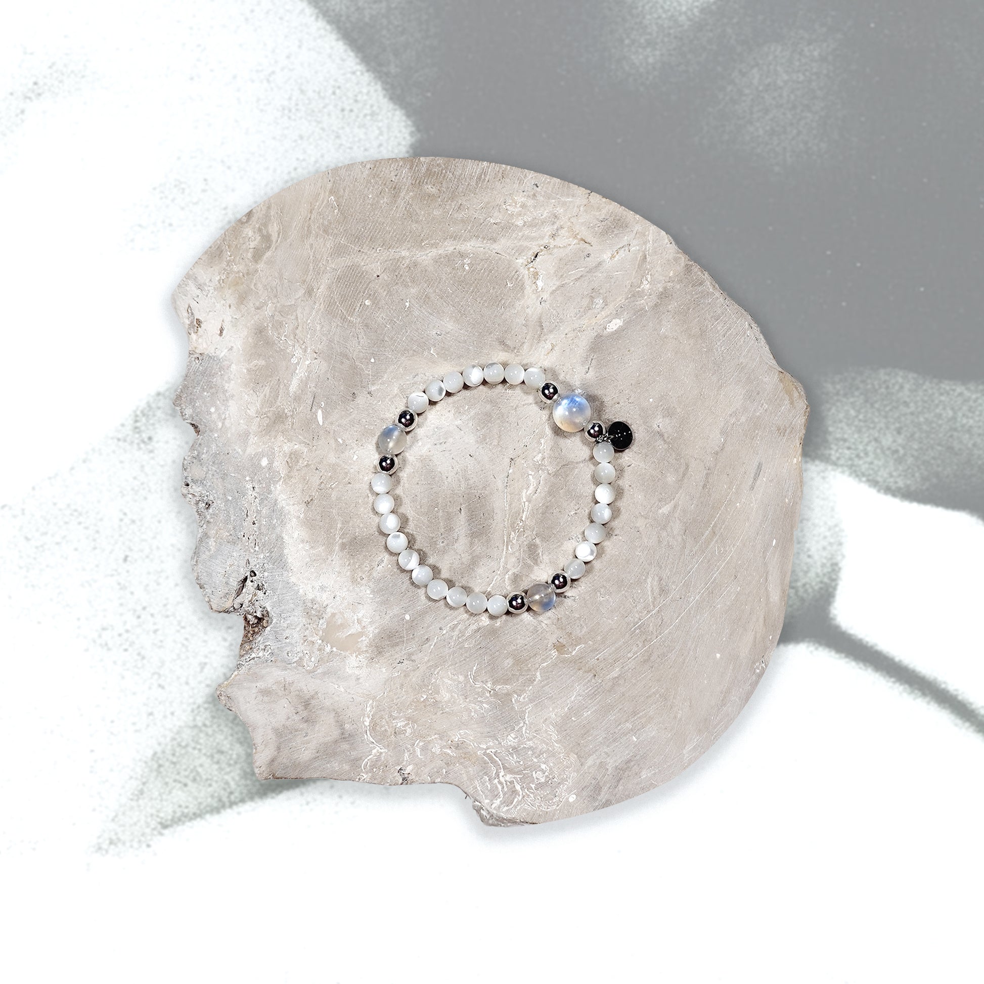 Delicate as moonlight and fluid as a quiet stream, the Lunaris Bracelet weaves the luminous glow of Mother of Pearl with the iridescent sheen of Moonstone. Known for its otherworldly glow—like light captured beneath water—Moonstone radiates a soft, inner fire that shifts with every movement. Honoring the clarity of Metal and the flow of Water, this bracelet embodies purity, intuition, and quiet resilience. Its dainty, minimalist design makes it perfect for layering or wearing alone as a whisper of elegance and light. A gentle reminder to stay soft, radiant, and in tune with your inner rhythm.