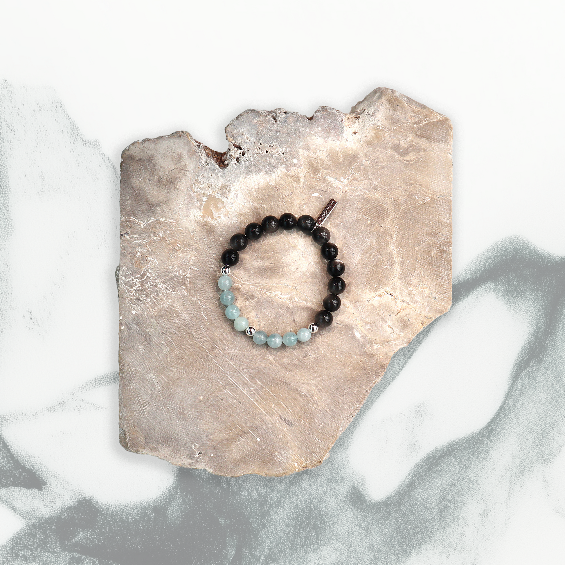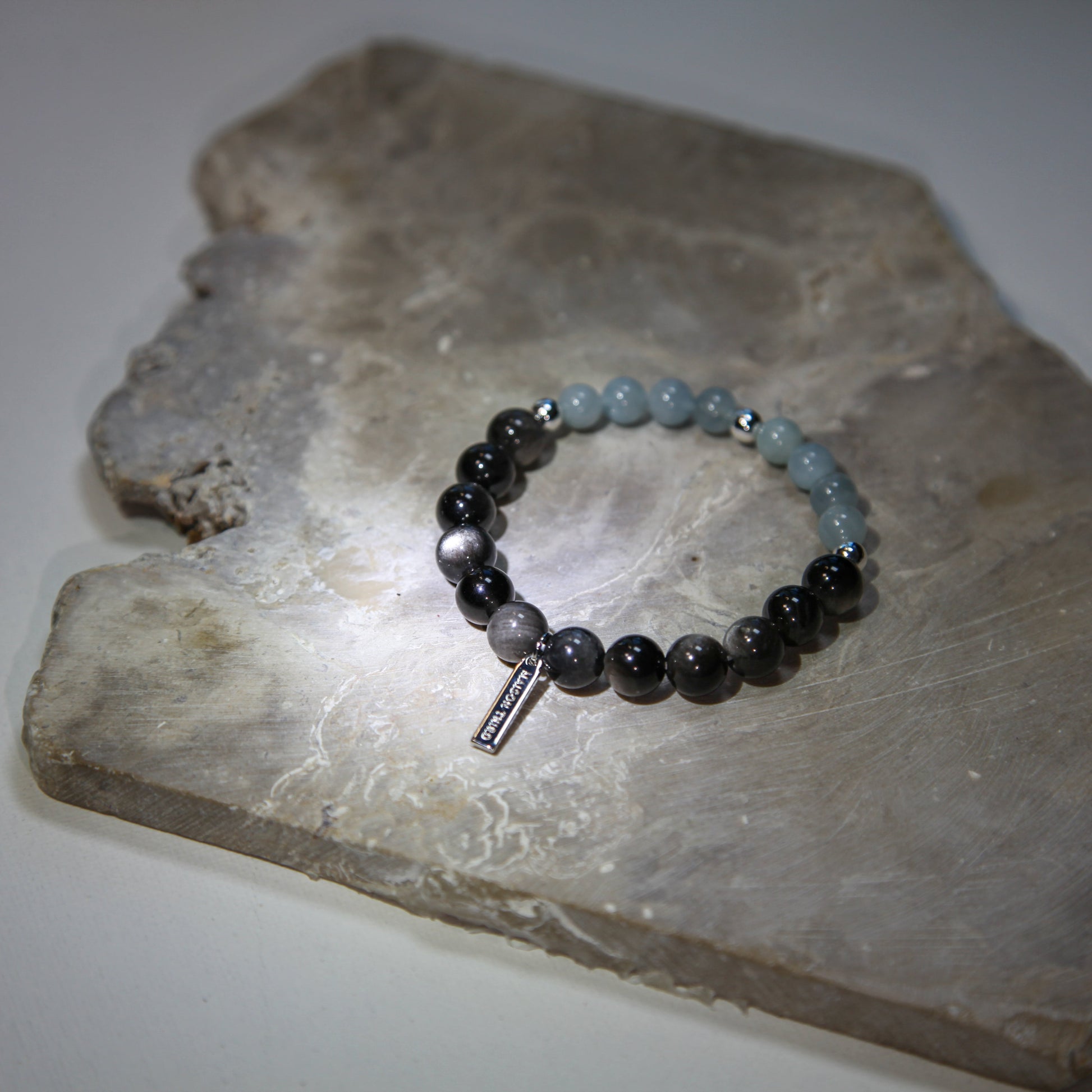 The Obsidian Sea Bracelet embodies the Water element with aquamarine’s cool, translucent blue and silver obsidian’s shifting, reflective sheen. As light dances across its surface, silver obsidian reveals hidden depths, much like ripples on water. Fluid, elegant, and ever-changing, this piece brings a sense of serenity and mysterious sophistication to any look.