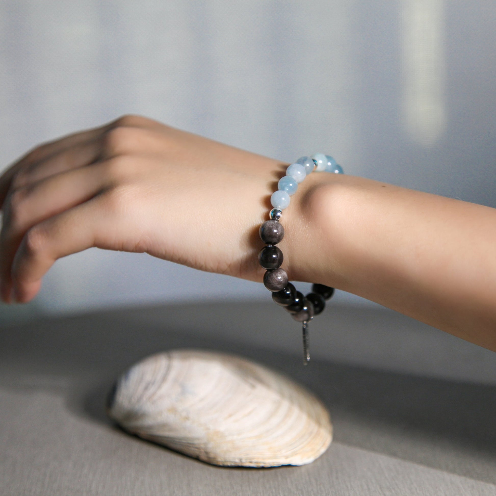 ✦Gemstones: Aquamarine, known as the stone of the sea, promotes clarity, emotional balance, and smooth communication. It is believed to wash away stress and fear, encouraging a sense of peace and fluidity in life. Silver obsidian is a powerful protective stone symbolizing self-reflection and inner strength. It helps to clear negative energy, enhance intuition, and reveal hidden truths, making it a stone of deep insight and transformation.