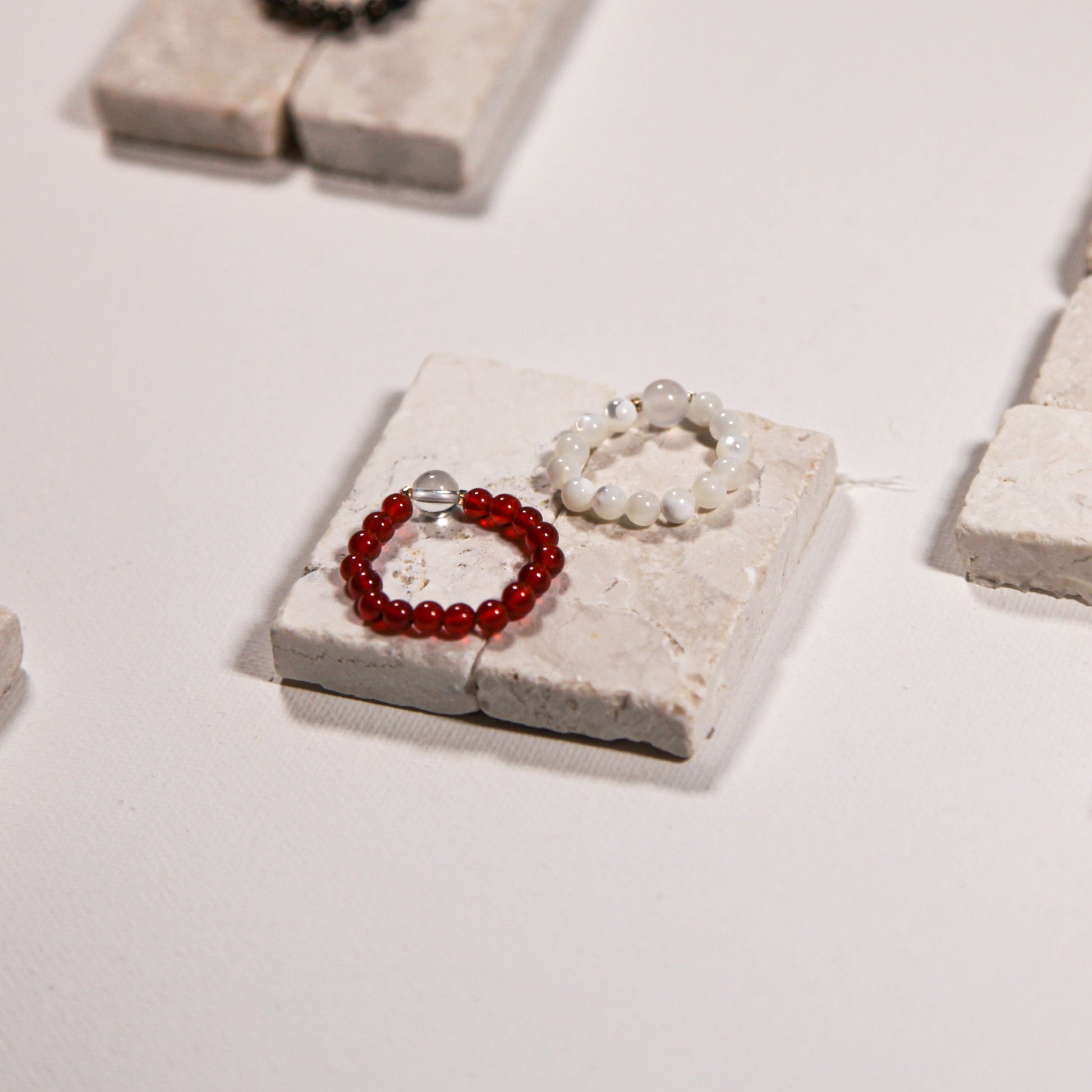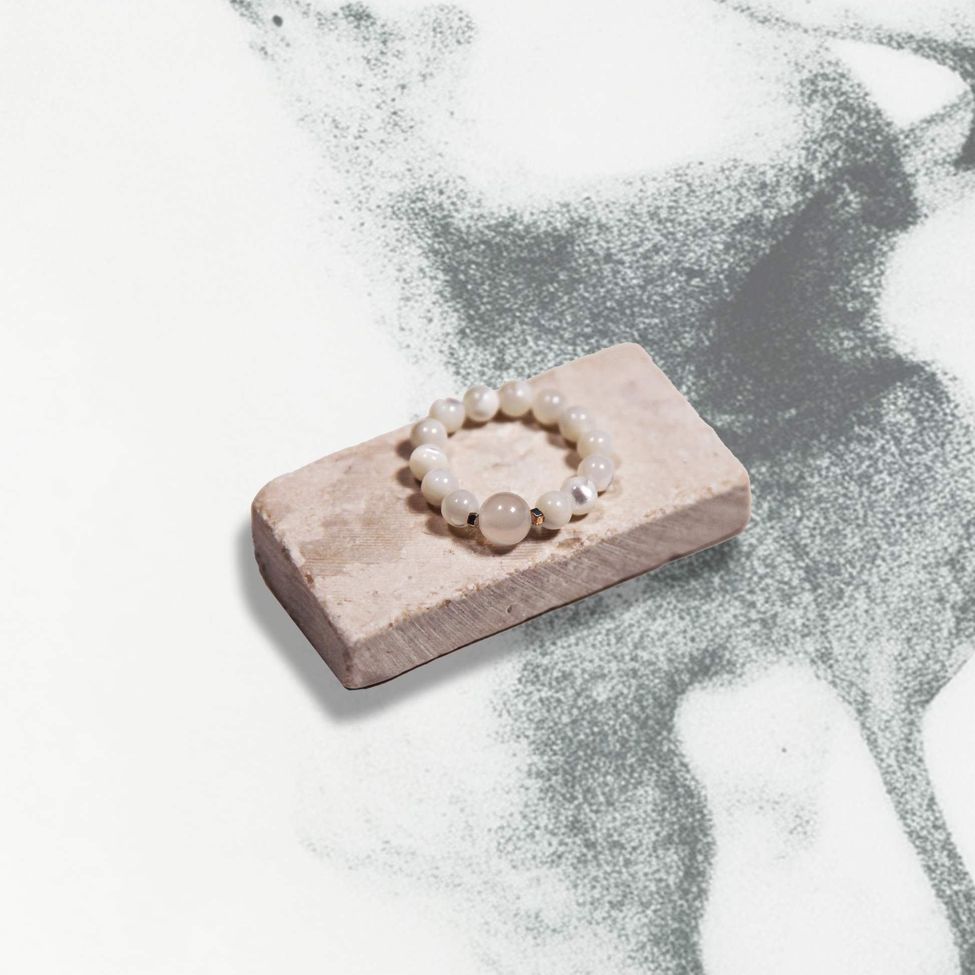 The Pure Lumina beaded ring captures serene light, like moonlight on calm waters. Featuring Mother-of-Pearl and White Jade, it embodies the purity and clarity of the Metal element. This piece is a reminder of inner light, peace, and the guiding force of the stars.