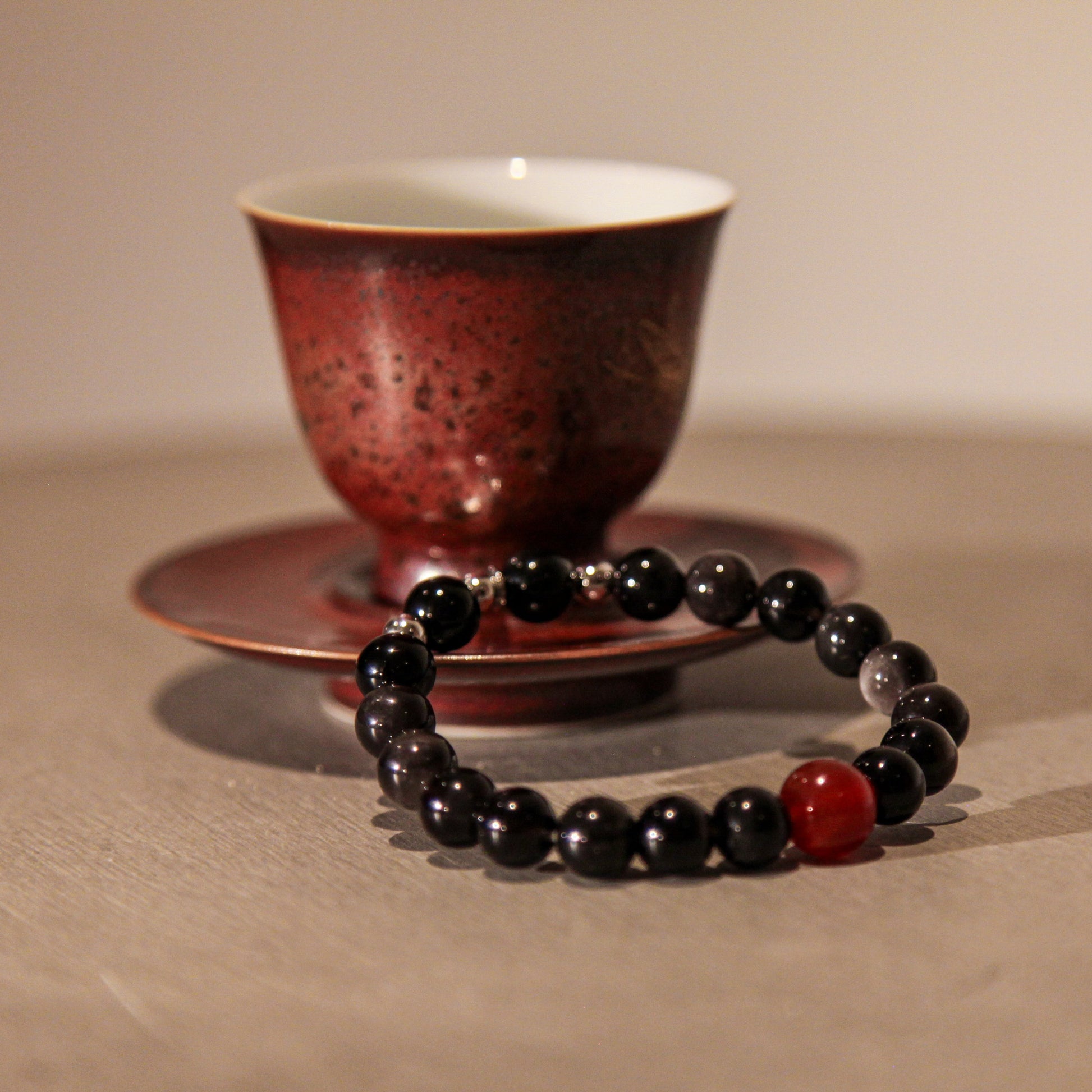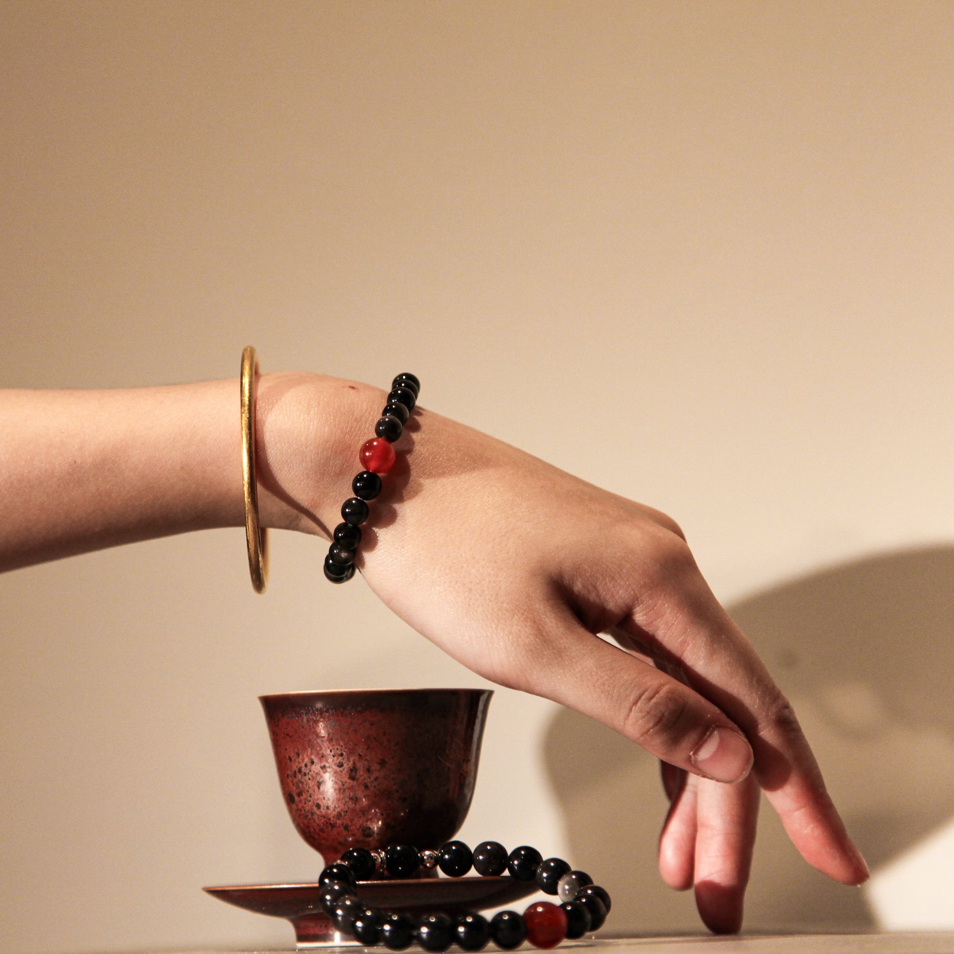 Bold yet centered, Shadow & Spark pairs Silver Obsidian’s grounding depth with a single fiery Carnelian. This Water and Fire union radiates both calm and courage—like a hidden ember glowing beneath the surface. A symbol of passion rising from stillness, it’s made for those who carry quiet fire.